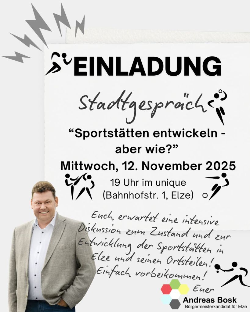 Ich lade Sie und Euch herzlich zu meinem nächsten Stadtgespräch „Sportstätten entwickeln – aber wie?“ ein! Am Mittwoch, 12. November 2025, 19:00 Uhr im Unique Bar & Bistro in Elze möchte ich mit Ihnen und Euch und Vertretern aus den Vereinen über die Zukunft der Sportstätten sprechen. Sportplätze, Hallen und Freizeitangebote sind ein wichtiger Teil unserer Lebensqualität – sie stärken Gemeinschaft, Gesundheit und das Vereinsleben. Dies ist mir ein großes Anliegen!